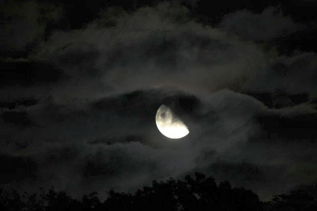 A near last-quarter moon captured by Tyler Hutchison on a partly cloudy night. More at https://tylerhutchisonastrophotography.wordpress.com/