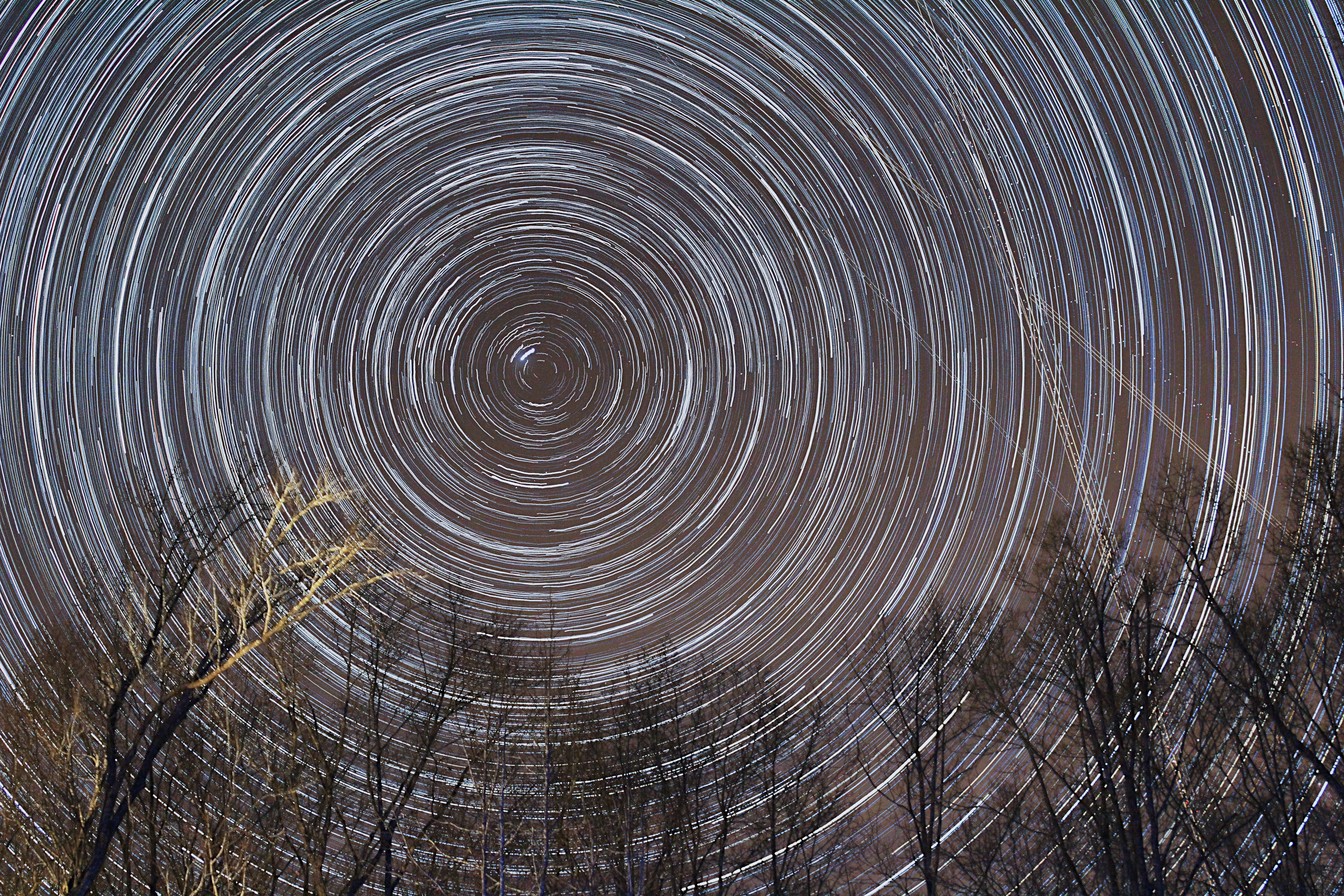 Star trails captured in a sequence of 320 30-second exposures at ISO 6400 on December 30, 2016. The individual images were combined into one composite using Startrails software. A video showing the image accumulation/compositing is at https://youtu.be/UCyaeLtAefI.